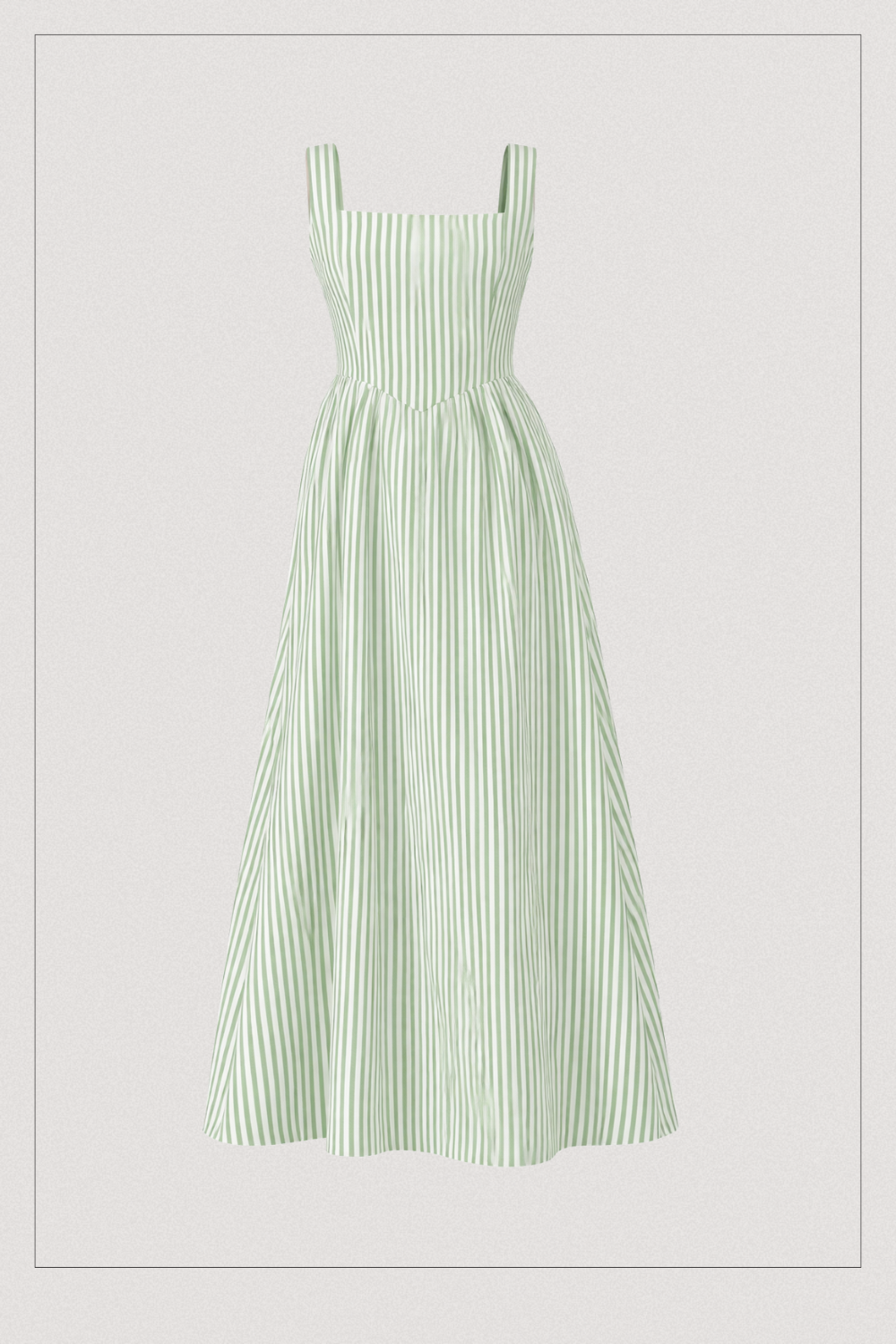 I might be a little biased, but this one is my favorite out of the three. If you love a clean, tailored silhouette, this green striped midi is such a chic option.